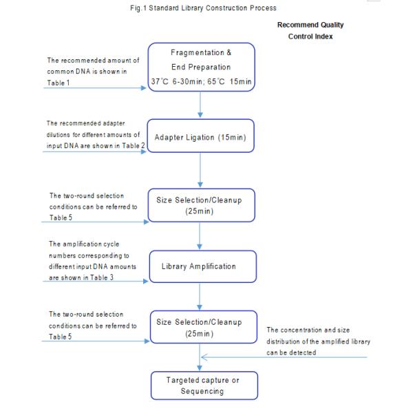 Aiming at MGI high-throughput sequencing platform, this kit provides a convenient and universal DNA library construction scheme in one tube. It combines fragmentation, end repair and A-Tailing into one step, greatly shortening the time of library construction and reducing the error caused by tedious steps. After fragmentation and end preparation, the product can be directly ligated with adapter without additional purification, and the subsequent procedure is the same as that of #KM001 Fast DNA Library Prep Kit for MGI. Complete library quantification can be performed by dsDNA fluorescent dye method (e.g., Thermo Qubit Flex Fluorometer) or absolute quantification PCR after diluting the library to an appropriate concentration.